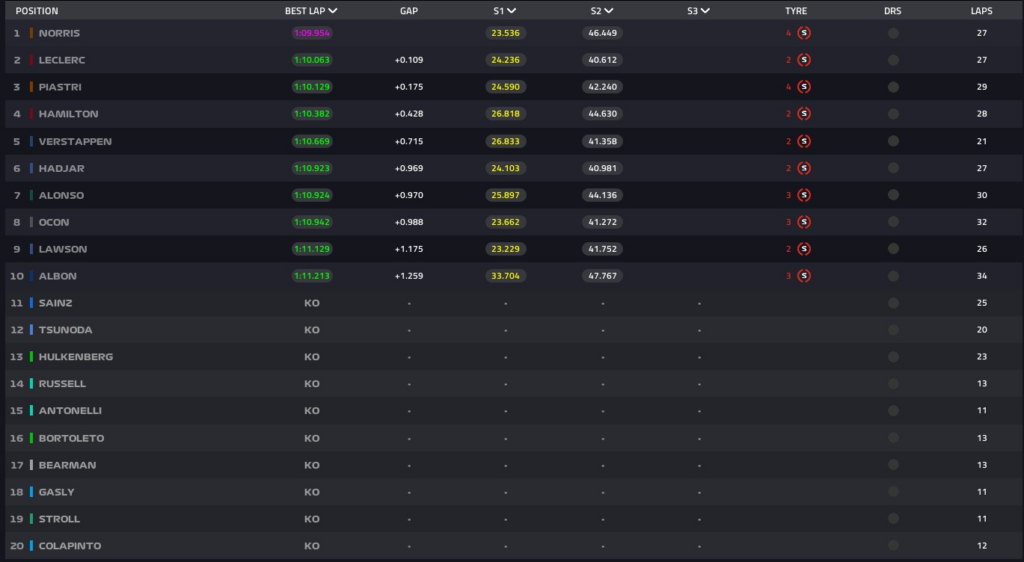 O segmento começou com Norris na ponta, tendo 0s1 de vantagem sobre Verstappen – Leclerc, em terceiro, calçava pneus médios ao invés dos tradicionais macios, assim como Albon, quarto; Hamilton, nono e Sainz, décimo. No entanto, uma falha elétrica fez Russell parar dentro do túnel a dez minutos da bandeirada; seu carro apagou após ele passar por um solavanco na saída da Sainte Devote.